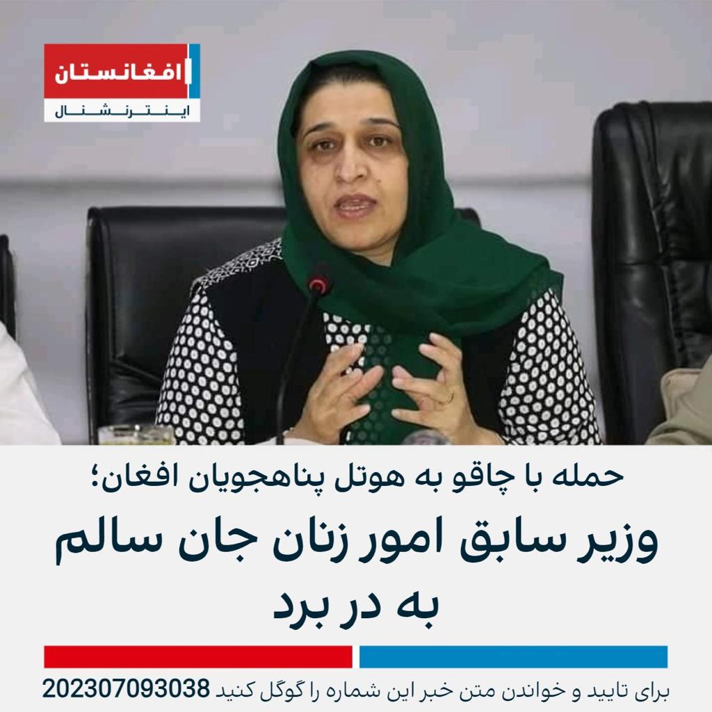 دغې شبکې پر خپله ټویټر پاڼه د ښځو چارو د پخوانۍ وزیرې حسینې صافۍ انځور خپور کړی او ترې لاندې یې لیکلي: «د افغان پناه غوښتونکو پر هوټل په چاقو سره برید؛ د ښځو چارو پخوانۍ وزیره له دې بریده روغه ووته.»